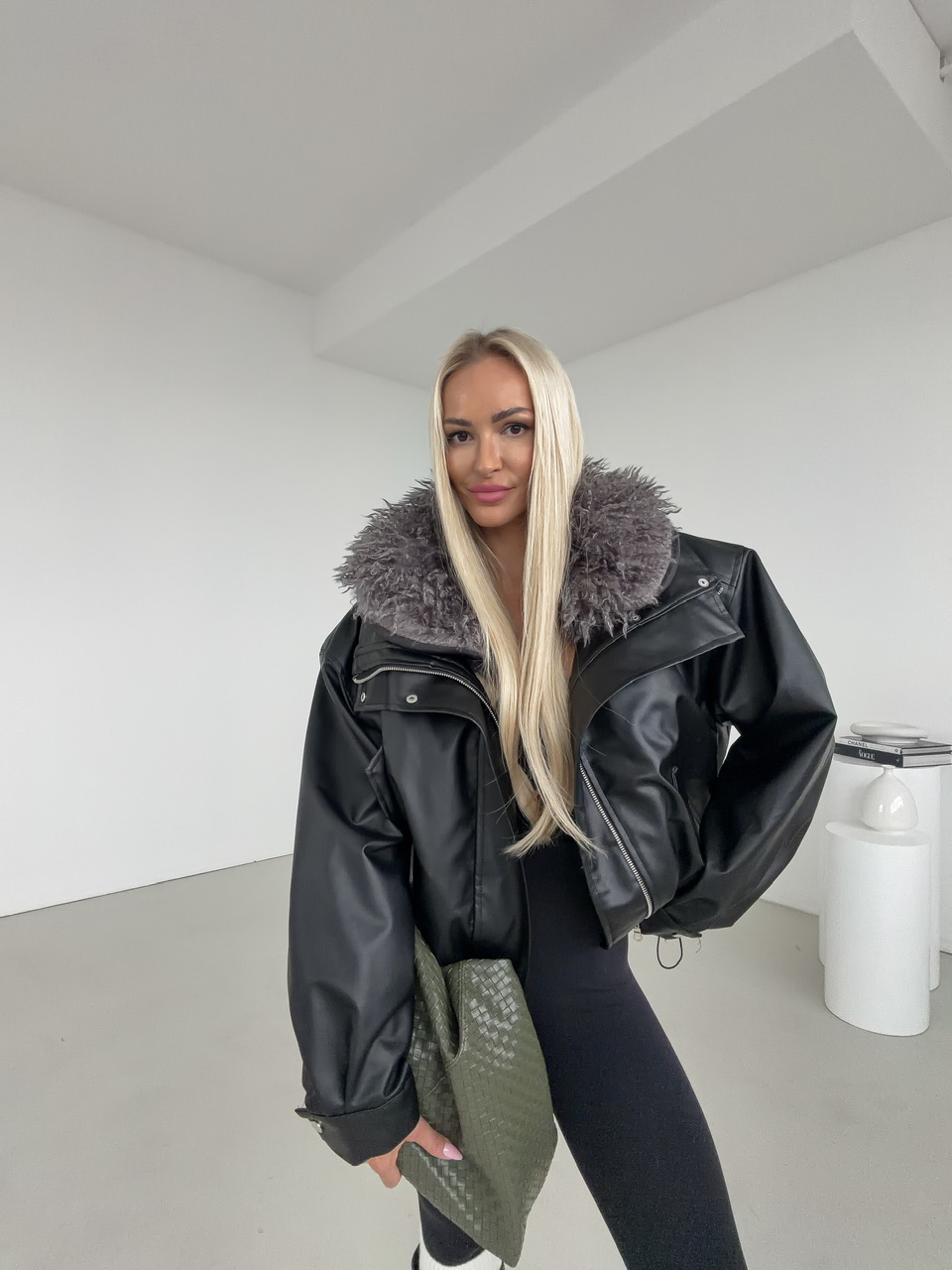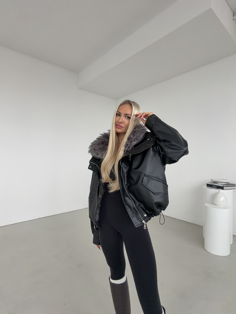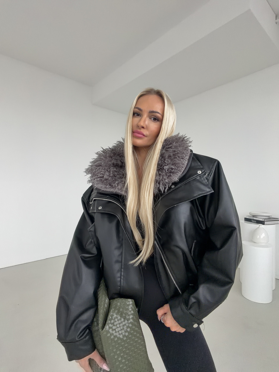 Štýlová čierna koženková bunda s výraznou vnútornou kožušinou v sivej farbe, ktorá zaručí nielen trendy vzhľad, ale aj príjemné teplo počas chladných dní. Vďaka svojmu oversize strihu pôsobí ležérne, no zároveň elegantne – ideálna voľba na jesenné a zimné obdobie. Bunda má praktické vrecká, zapínanie na zips a cvoky, ktoré dotvárajú jej moderný dizajn. Koženkový povrch dodáva luxusný vzhľad, zatiaľ čo mäkká kožušina vo vnútri zabezpečuje maximálne pohodlie.