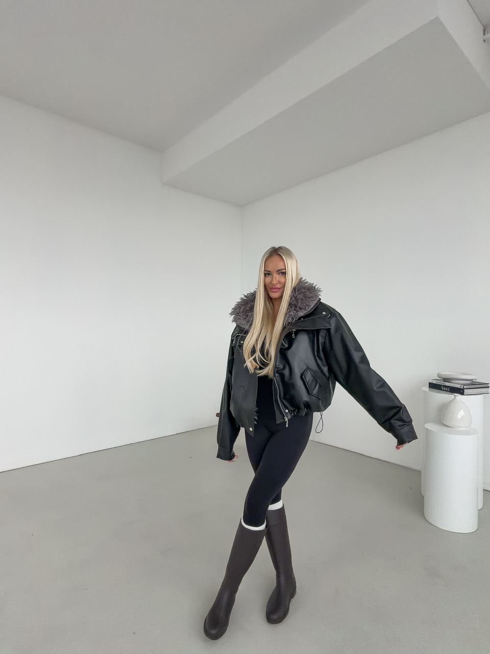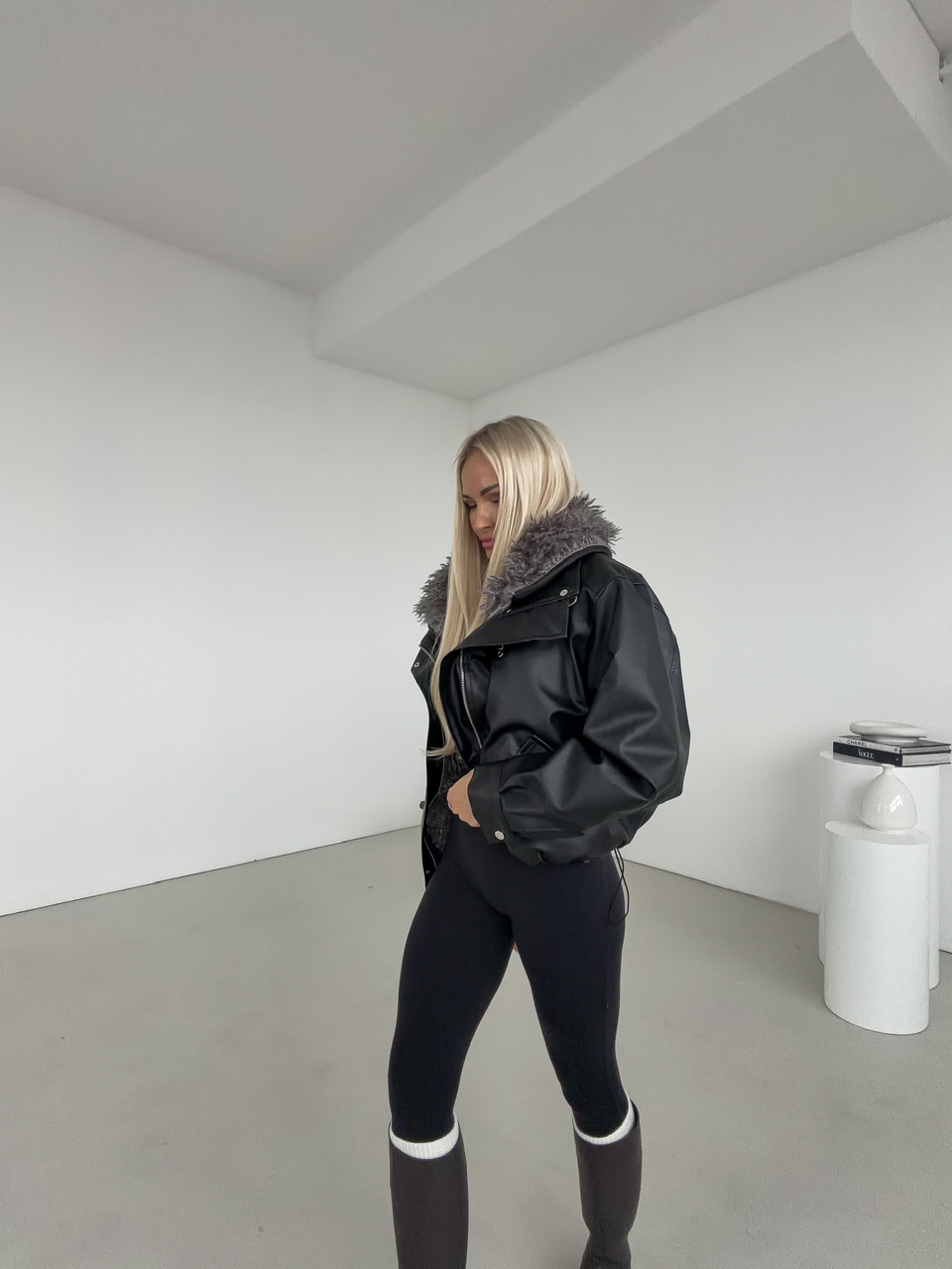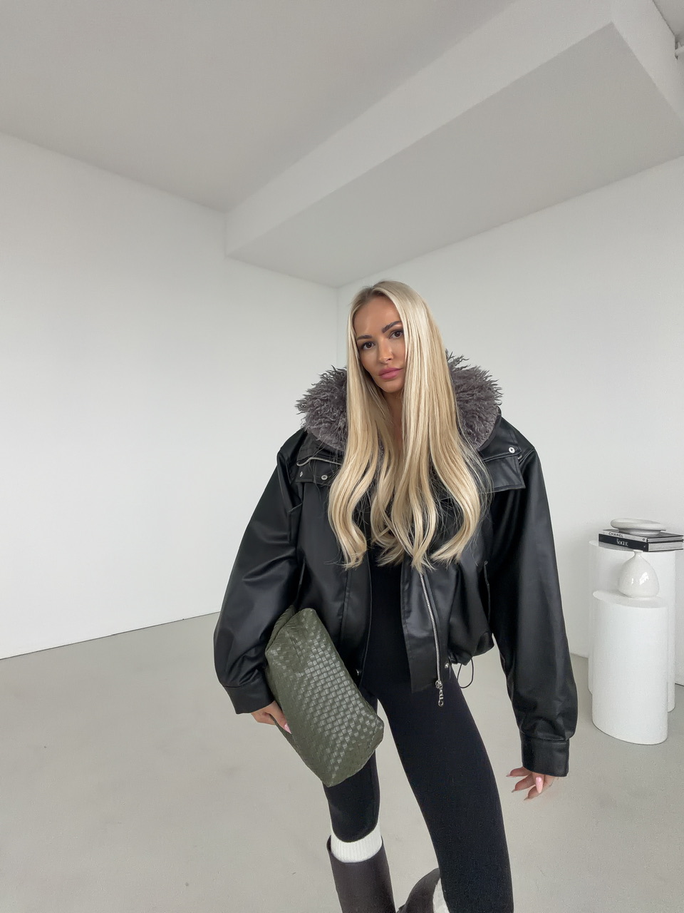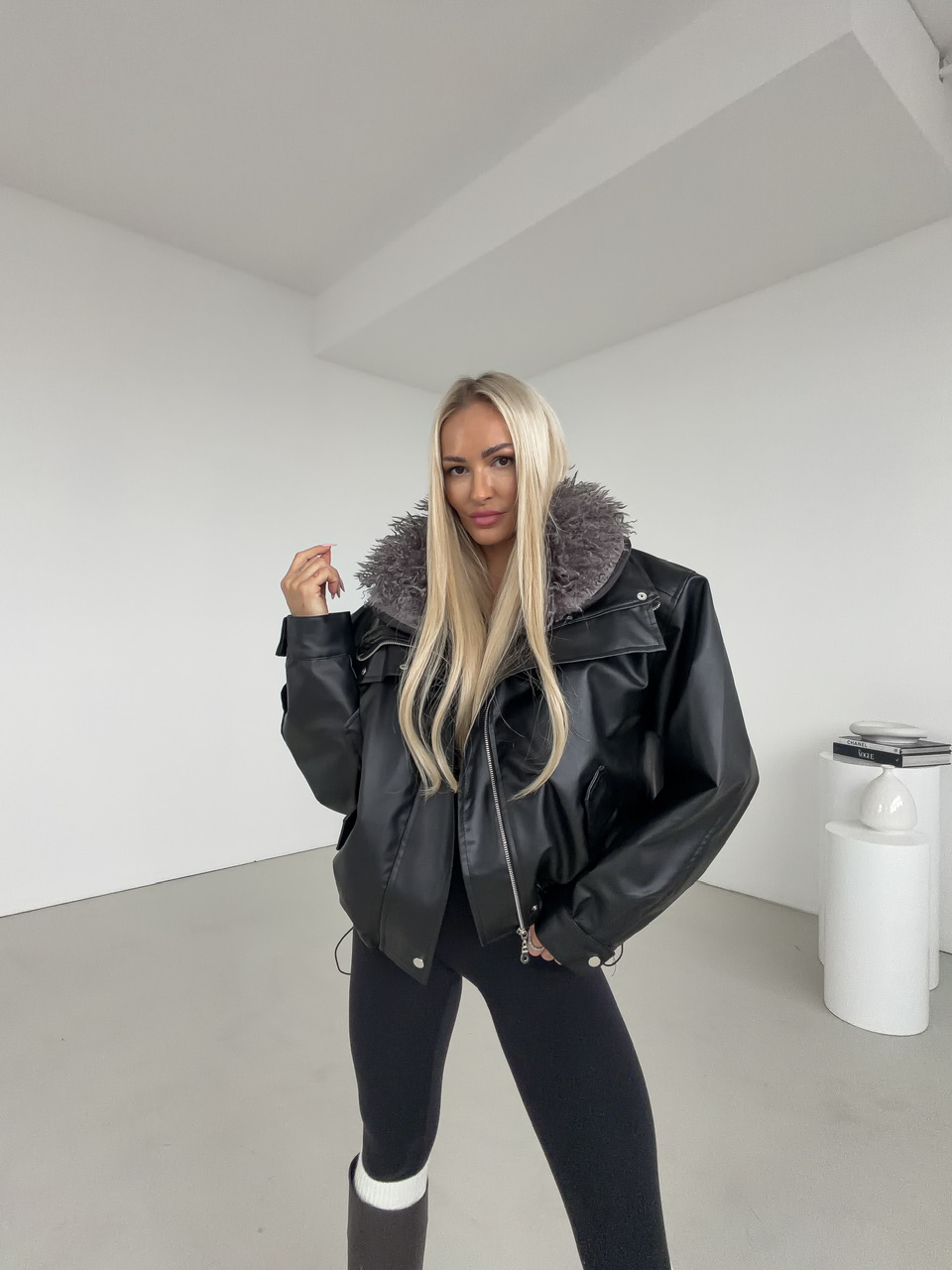 Štýlová čierna koženková bunda s výraznou vnútornou kožušinou v sivej farbe, ktorá zaručí nielen trendy vzhľad, ale aj príjemné teplo počas chladných dní. Vďaka svojmu oversize strihu pôsobí ležérne, no zároveň elegantne – ideálna voľba na jesenné a zimné obdobie. Bunda má praktické vrecká, zapínanie na zips a cvoky, ktoré dotvárajú jej moderný dizajn. Koženkový povrch dodáva luxusný vzhľad, zatiaľ čo mäkká kožušina vo vnútri zabezpečuje maximálne pohodlie.