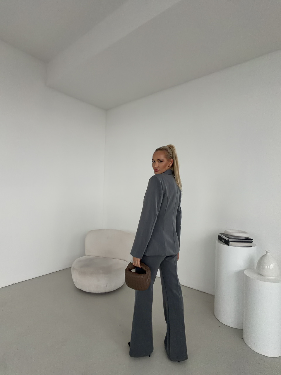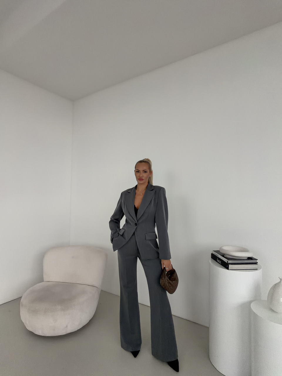 Sako má falošné vrecká, ktoré dodávajú moderný vzhľad bez narušenia hladkej línie, a výstrih do tvaru V, ktorý jemne zvýrazňuje dekolt. Vypchávky na pleciach opticky formujú postavu a podčiarkujú štruktúru saka, zatiaľ čo užší strih elegantne obopína telo a zdôrazňuje ženskú siluetu. Tento model je ideálny na pracovné stretnutia, spoločenské príležitosti aj každodenné štýlové kombinácie.