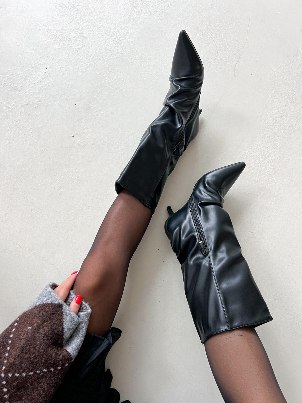 Čierne čižmy na mierne vysokom podpätku (cca 6,5 cm). Predná časť sáry je naskŕčaná. Z vnútornej bočnej strany je polovičný zips na zapínanie.