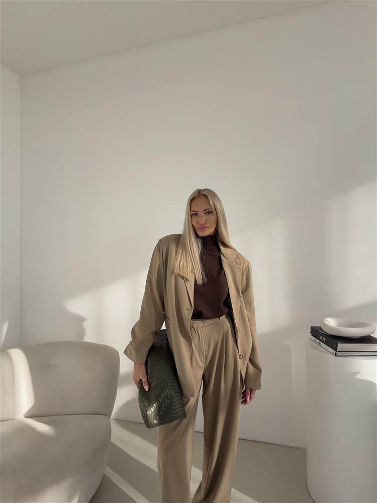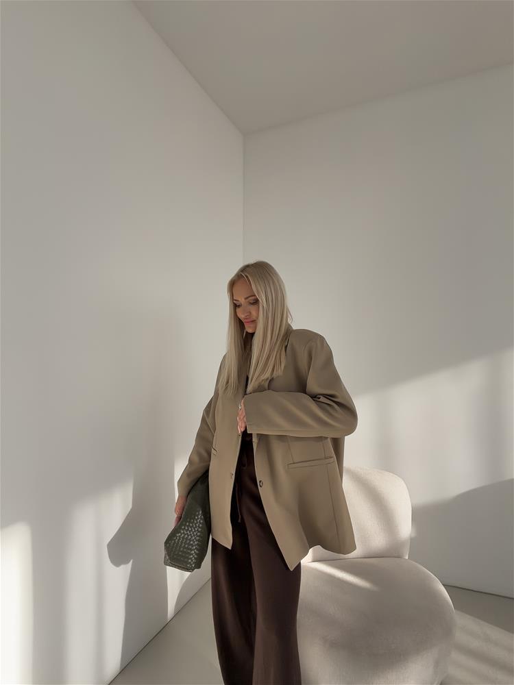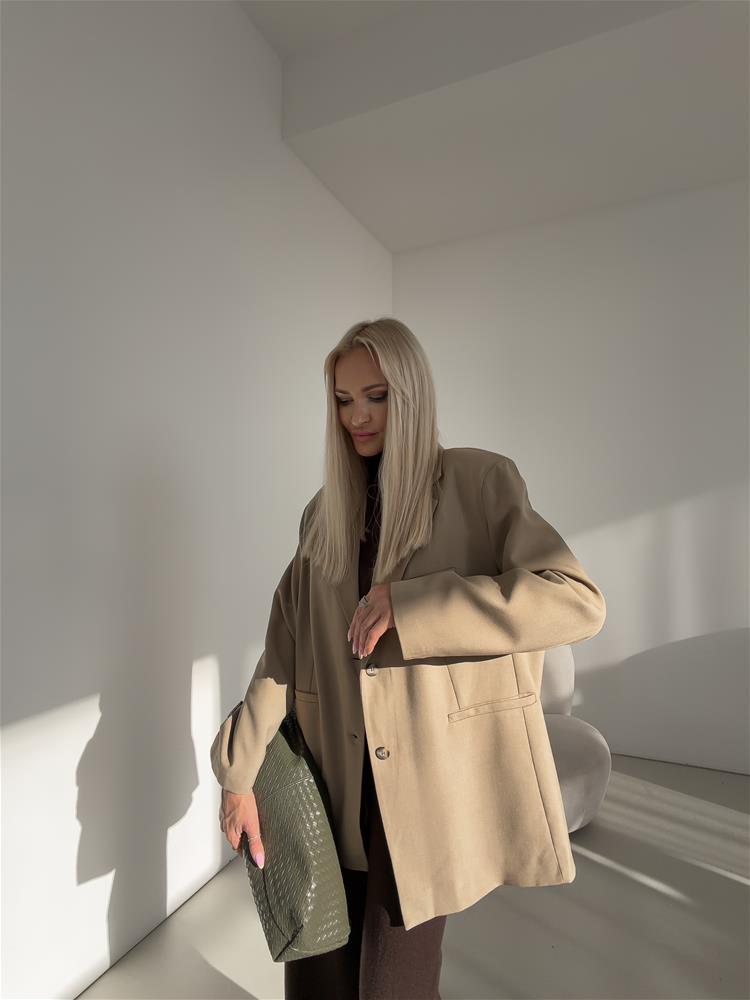 Oversize sako, ktoré má zapínanie na dva gombíky. S vypchávkami na pleciach a falošnými vreckami vpredu. Sako je podšité.