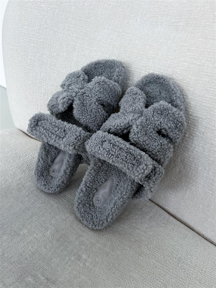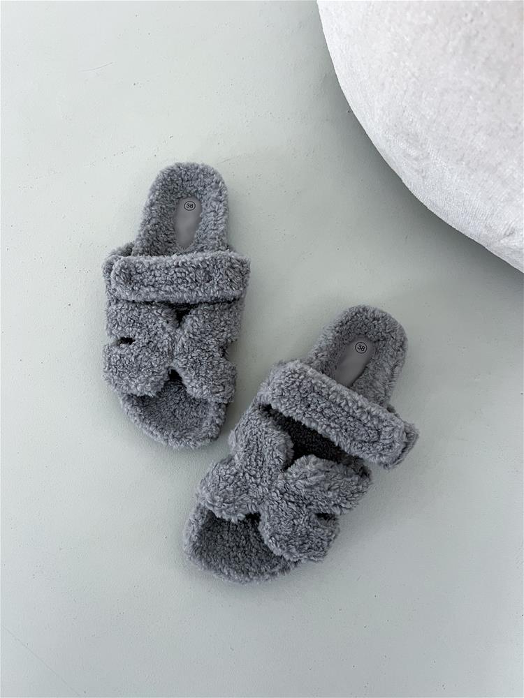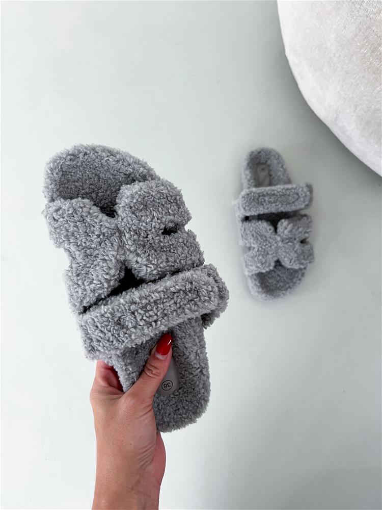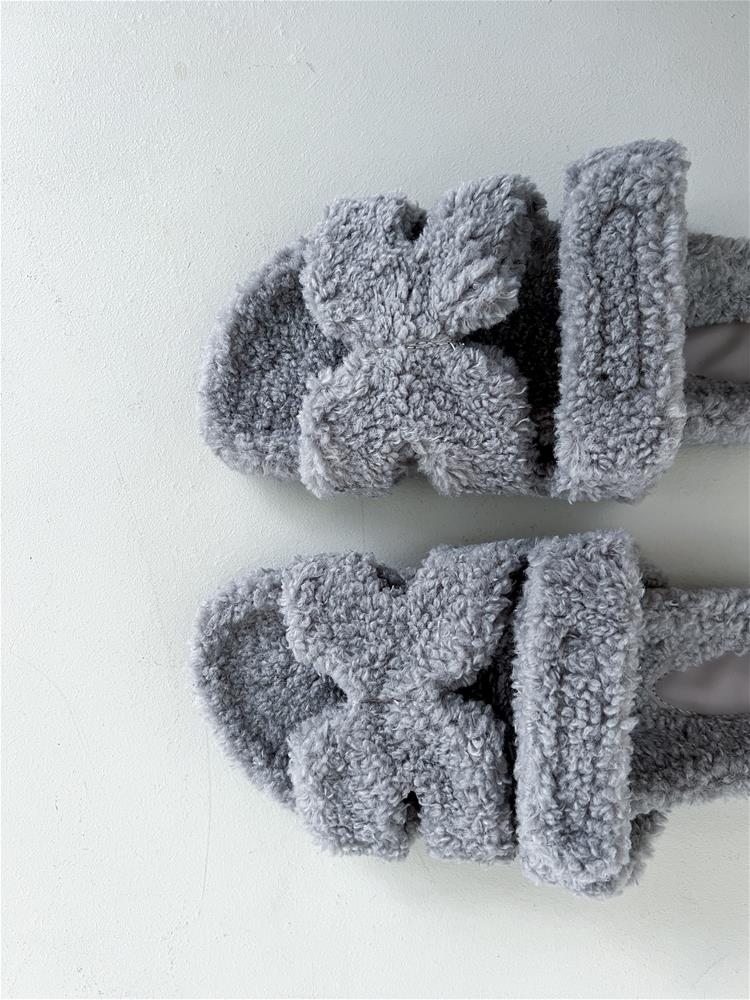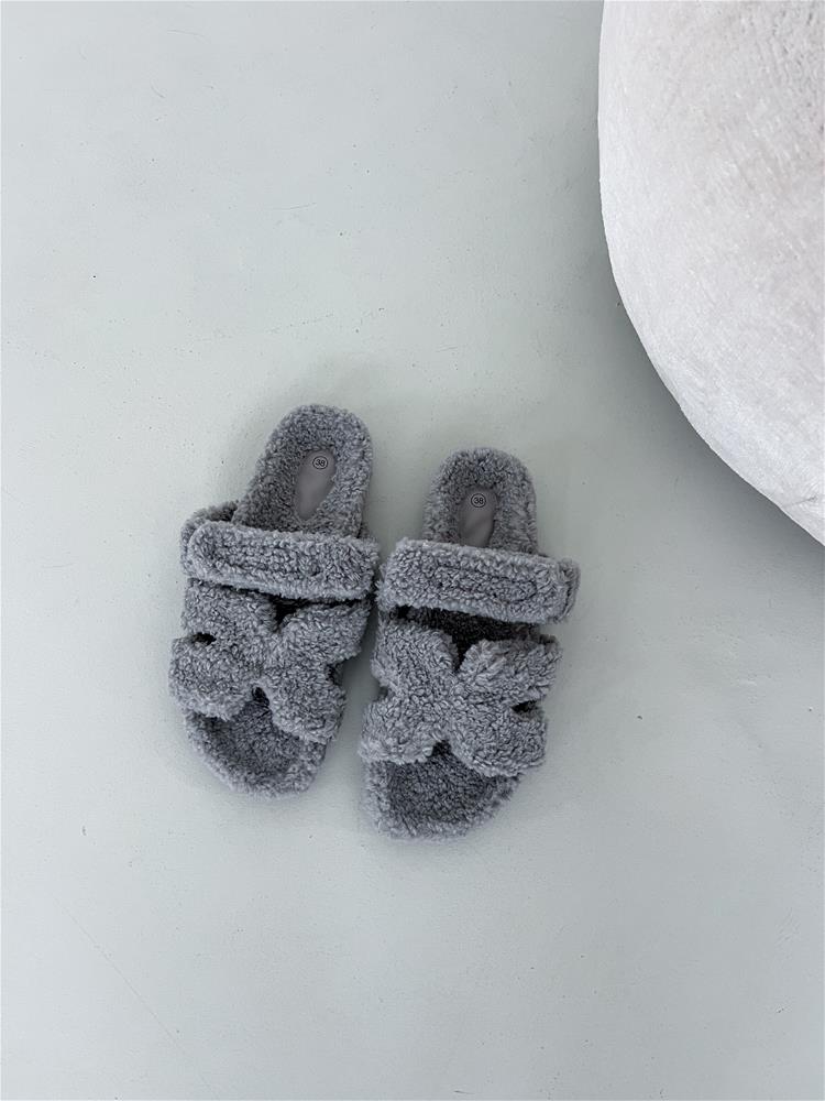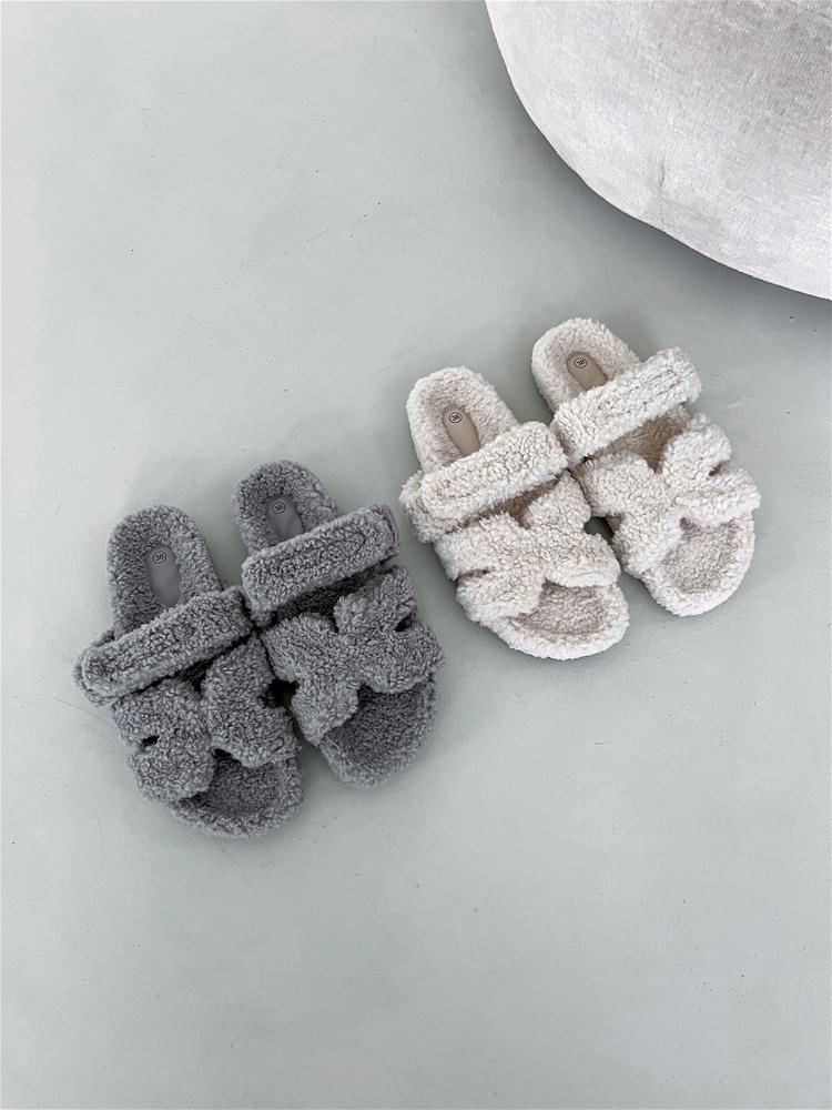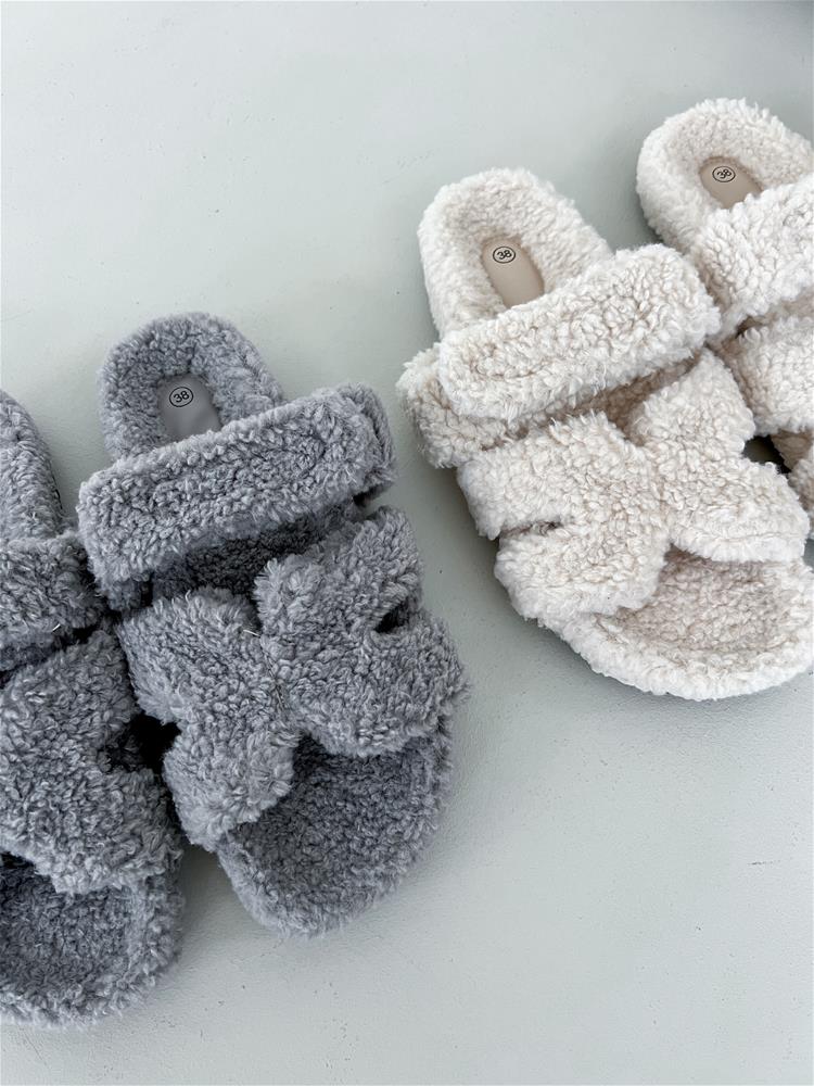 Nízke šľapky na rovnej pevnej podrážke. Zvršok sa skladá z umelej kožušinky a z dvoch častí. Jedna časť má suchý zips, ktorý sa dá prispôsobiť.