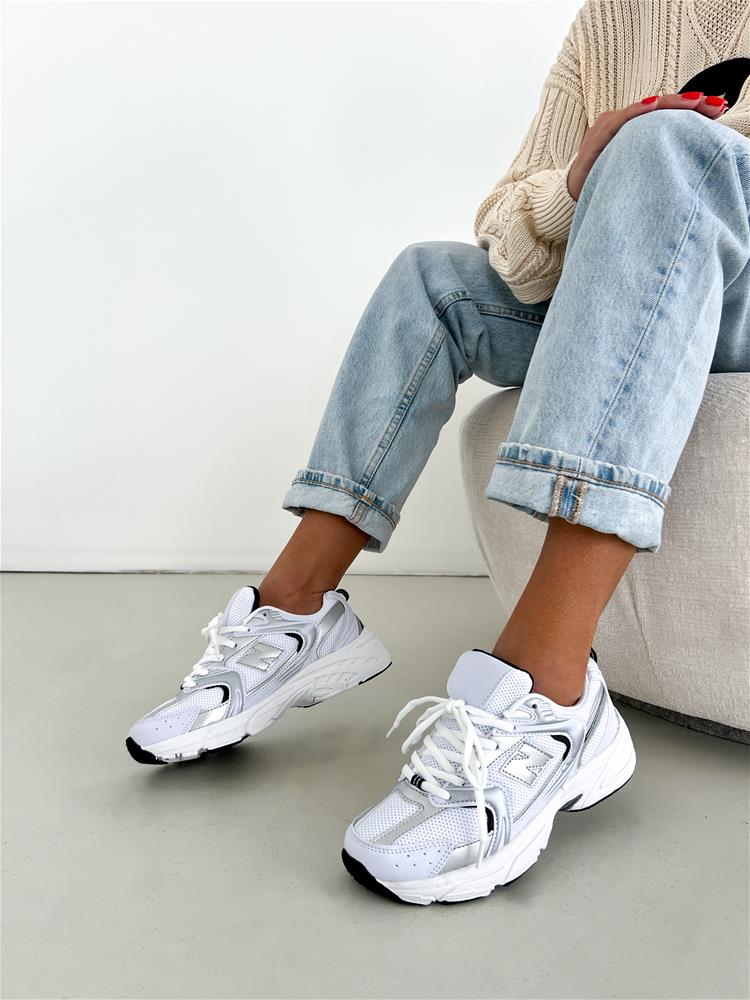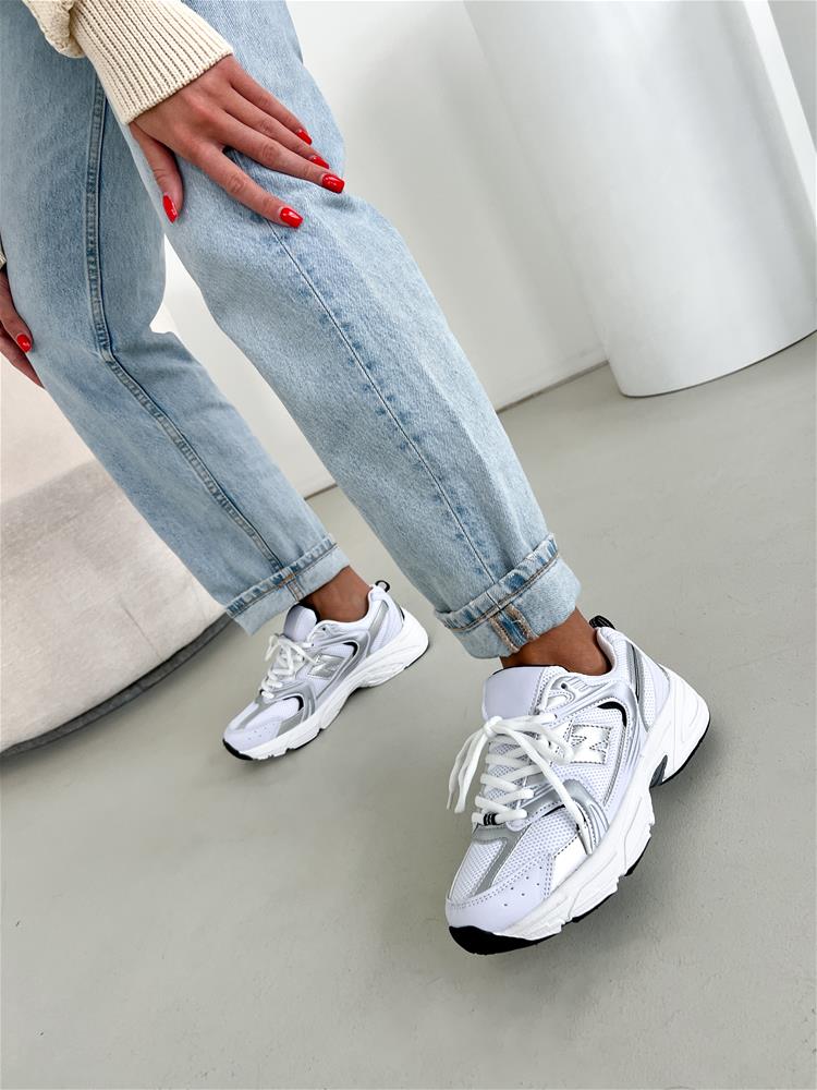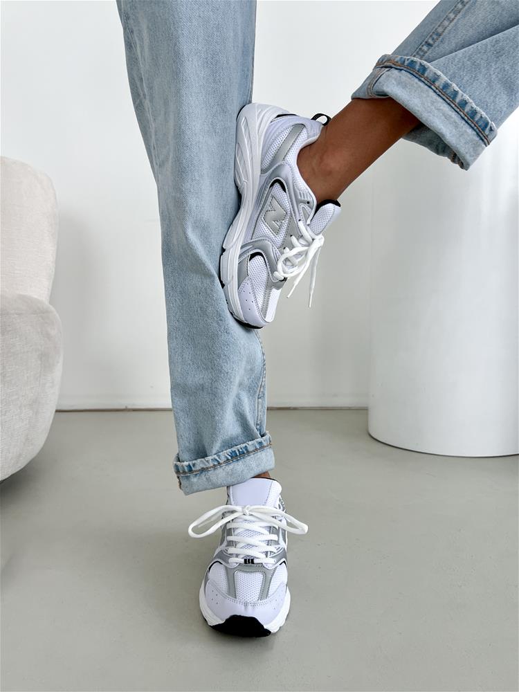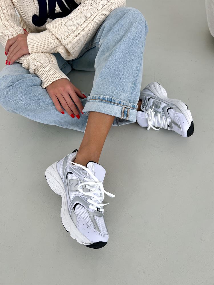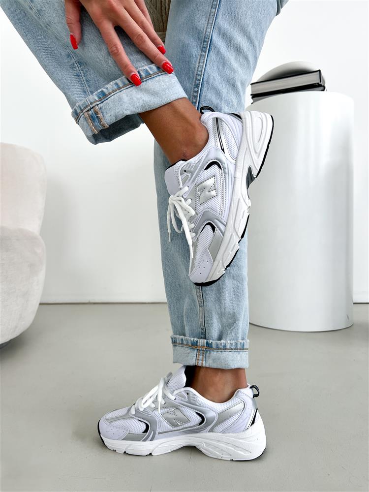 Ľahká športová obuv v bielej farbe so striebornými prvkami. Zvršok sa skladá z viacerých materiálov. Predná časť je na šnurovanie.