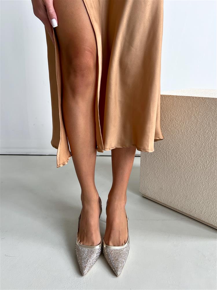 Zlaté elegantné lodičky na vysokom tenkom podpätku okruhlého tvaru (cca 9 cm). Zvršok je zdobený štrasovými kamienkami. Zadná časť päty je otvorená. Okolo päty je remienok so zlatou prackou na zapínanie.
