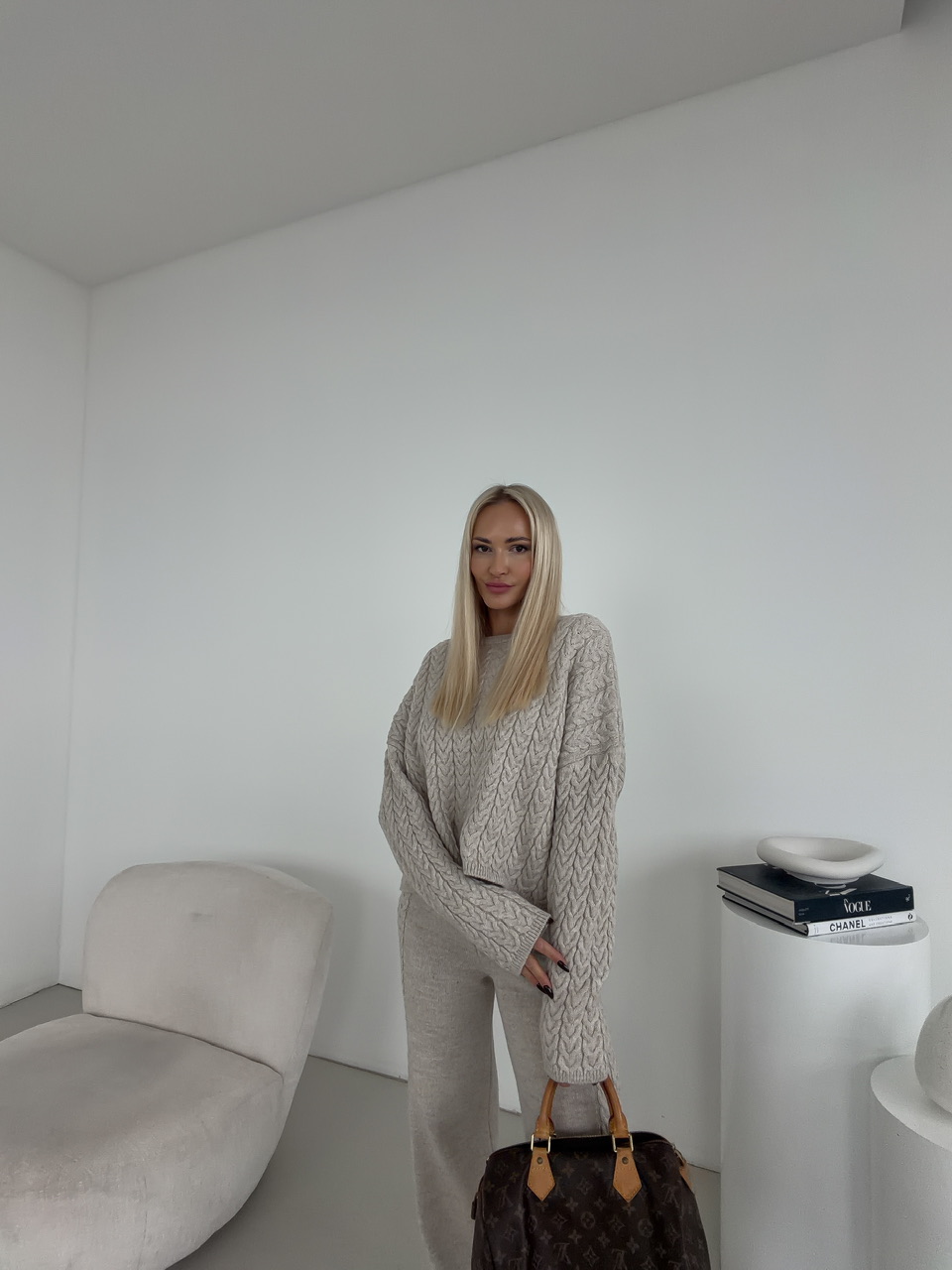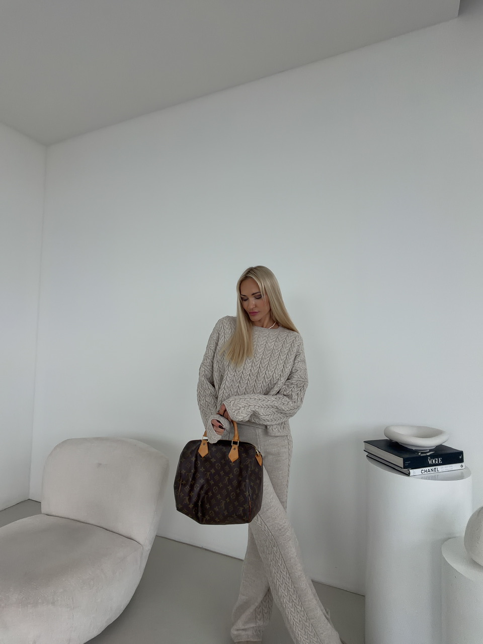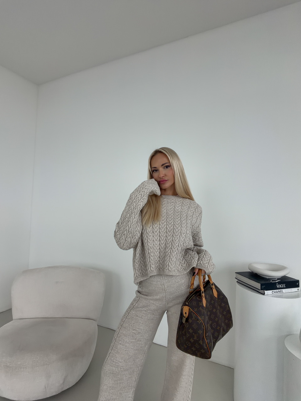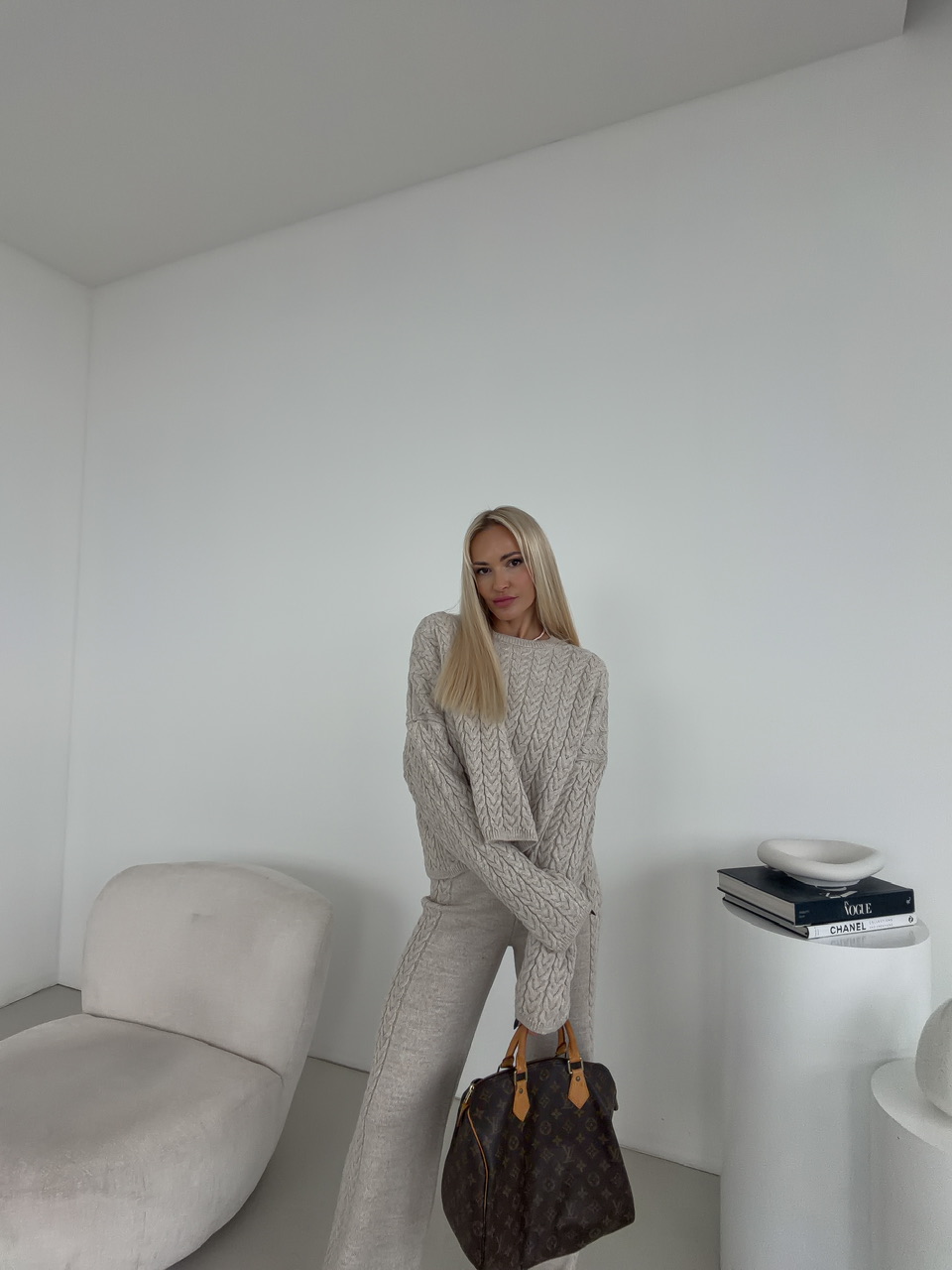 Pletený komplet pozostávajúci z pulóvra s okrúhlym výstrihom a pohodlných nohavíc s elastickým pásom je ideálnou voľbou pre maximálny komfort bez kompromisov v štýle. Mäkký pletený materiál príjemne zahreje a prispôsobí sa postave, zatiaľ čo guma v páse zabezpečuje pohodlné nosenie počas celého dňa. Nadčasový dizajn umožňuje nosiť jednotlivé kúsky spolu aj samostatne, čo z kompletu robí praktický a univerzálny outfit na každodenné nosenie aj voľný čas.