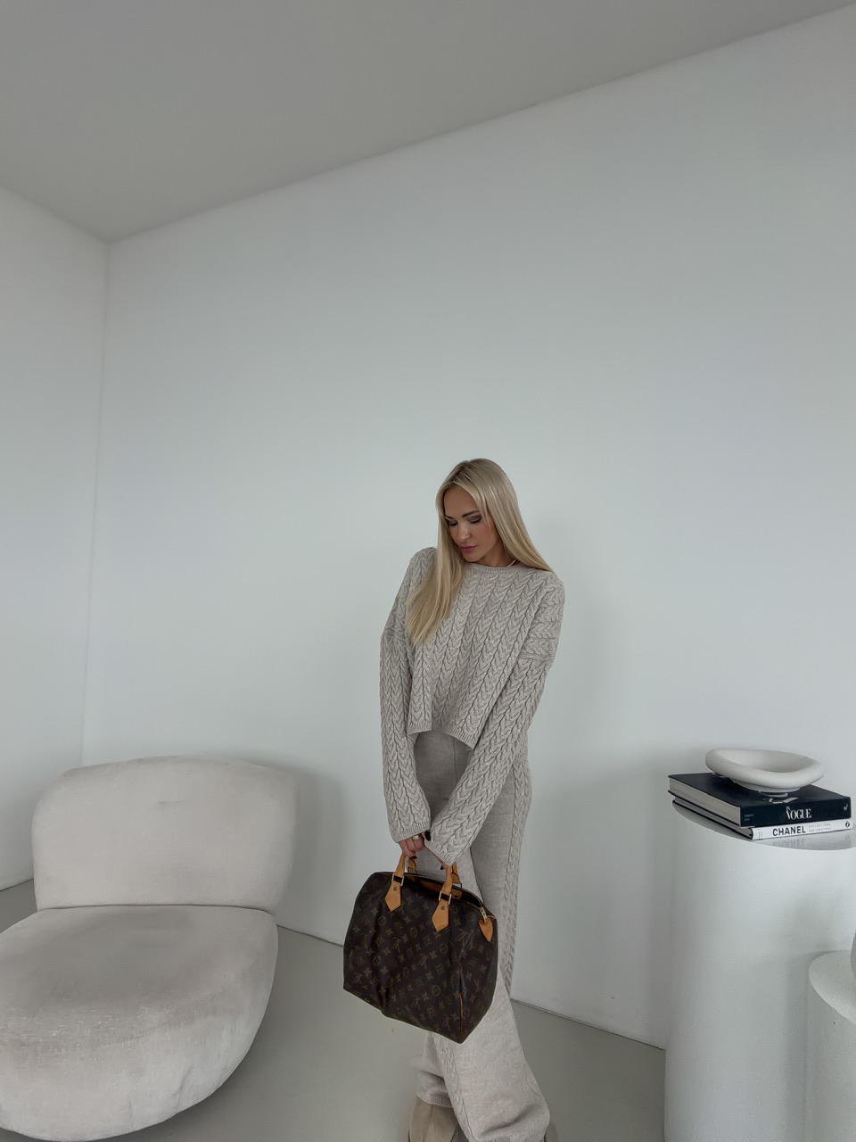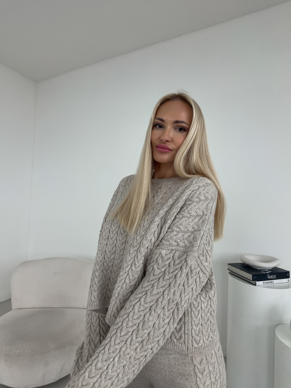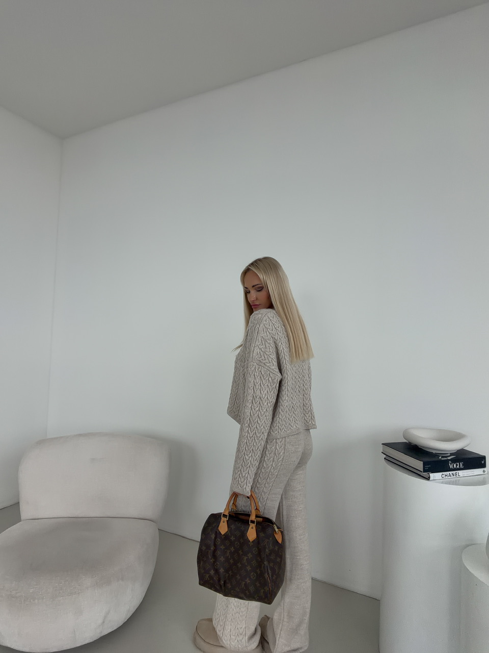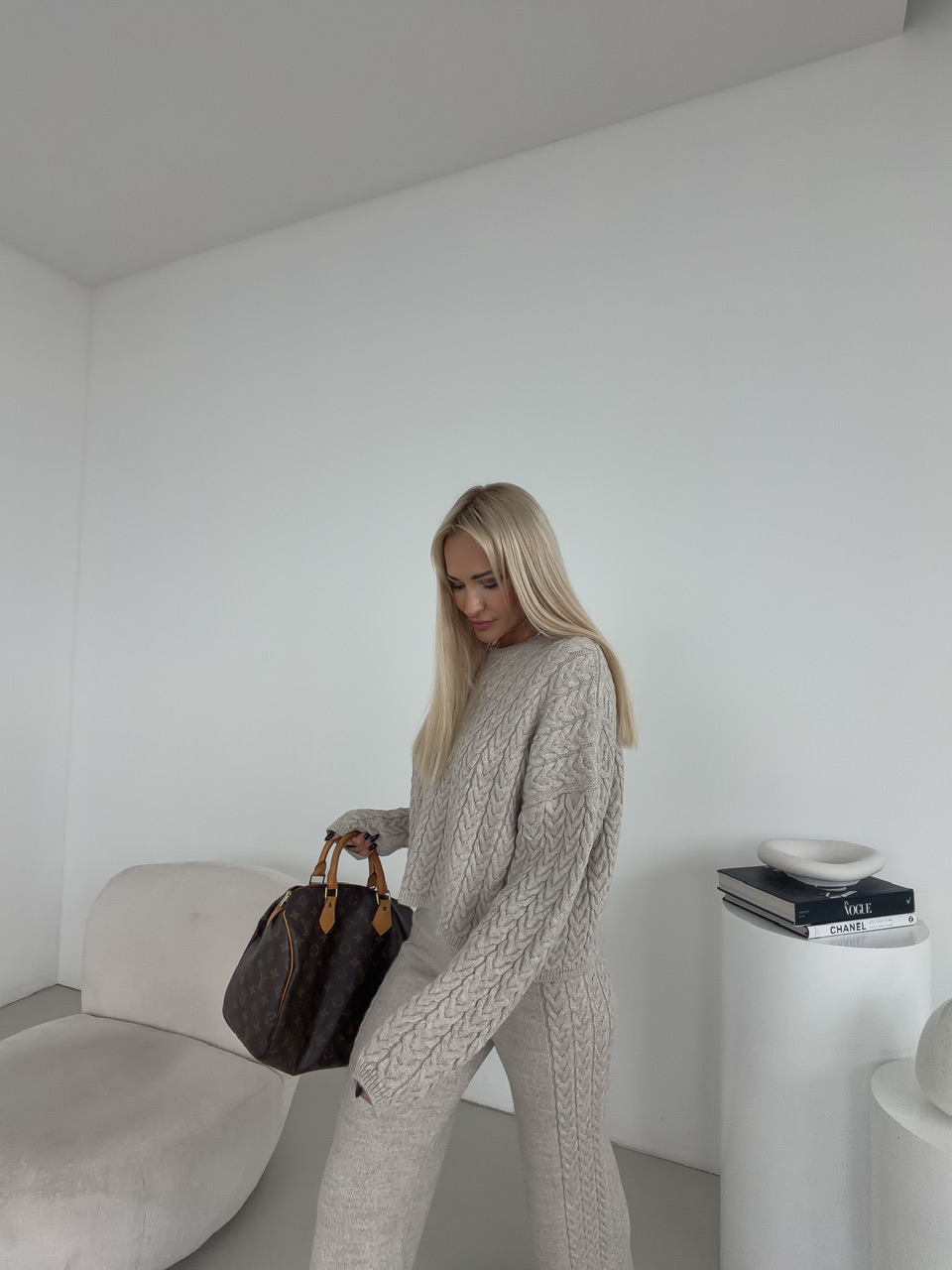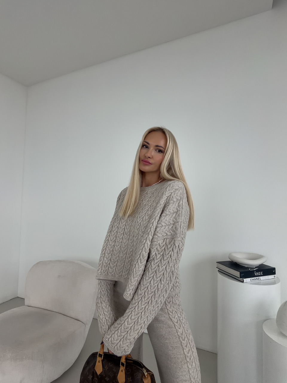 Pletený komplet pozostávajúci z pulóvra s okrúhlym výstrihom a pohodlných nohavíc s elastickým pásom je ideálnou voľbou pre maximálny komfort bez kompromisov v štýle. Mäkký pletený materiál príjemne zahreje a prispôsobí sa postave, zatiaľ čo guma v páse zabezpečuje pohodlné nosenie počas celého dňa. Nadčasový dizajn umožňuje nosiť jednotlivé kúsky spolu aj samostatne, čo z kompletu robí praktický a univerzálny outfit na každodenné nosenie aj voľný čas.