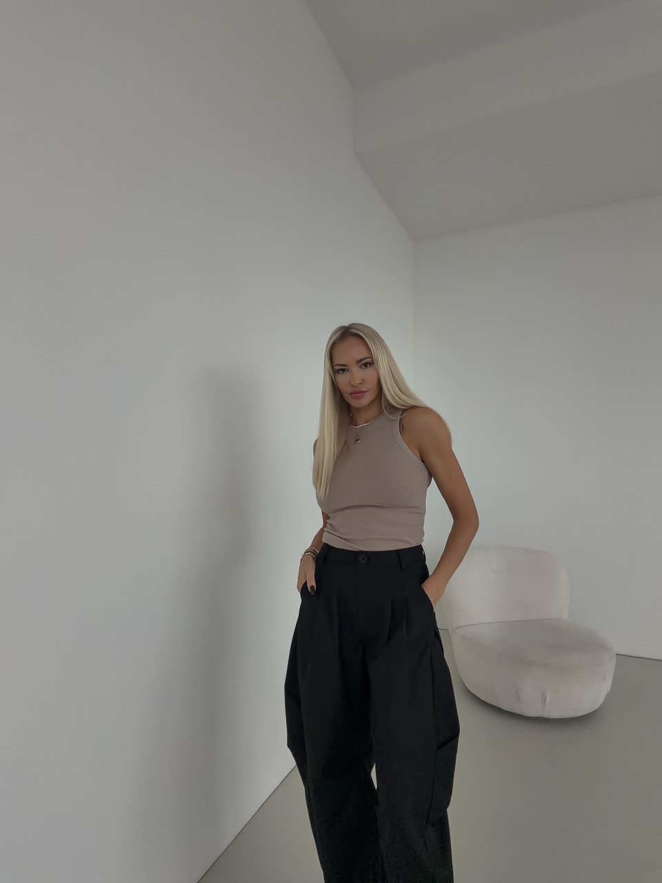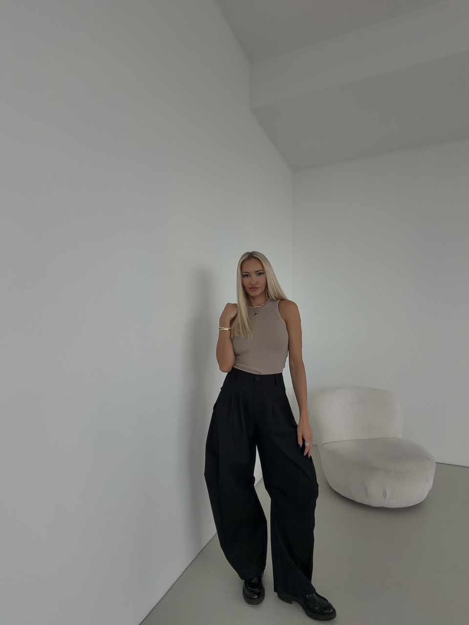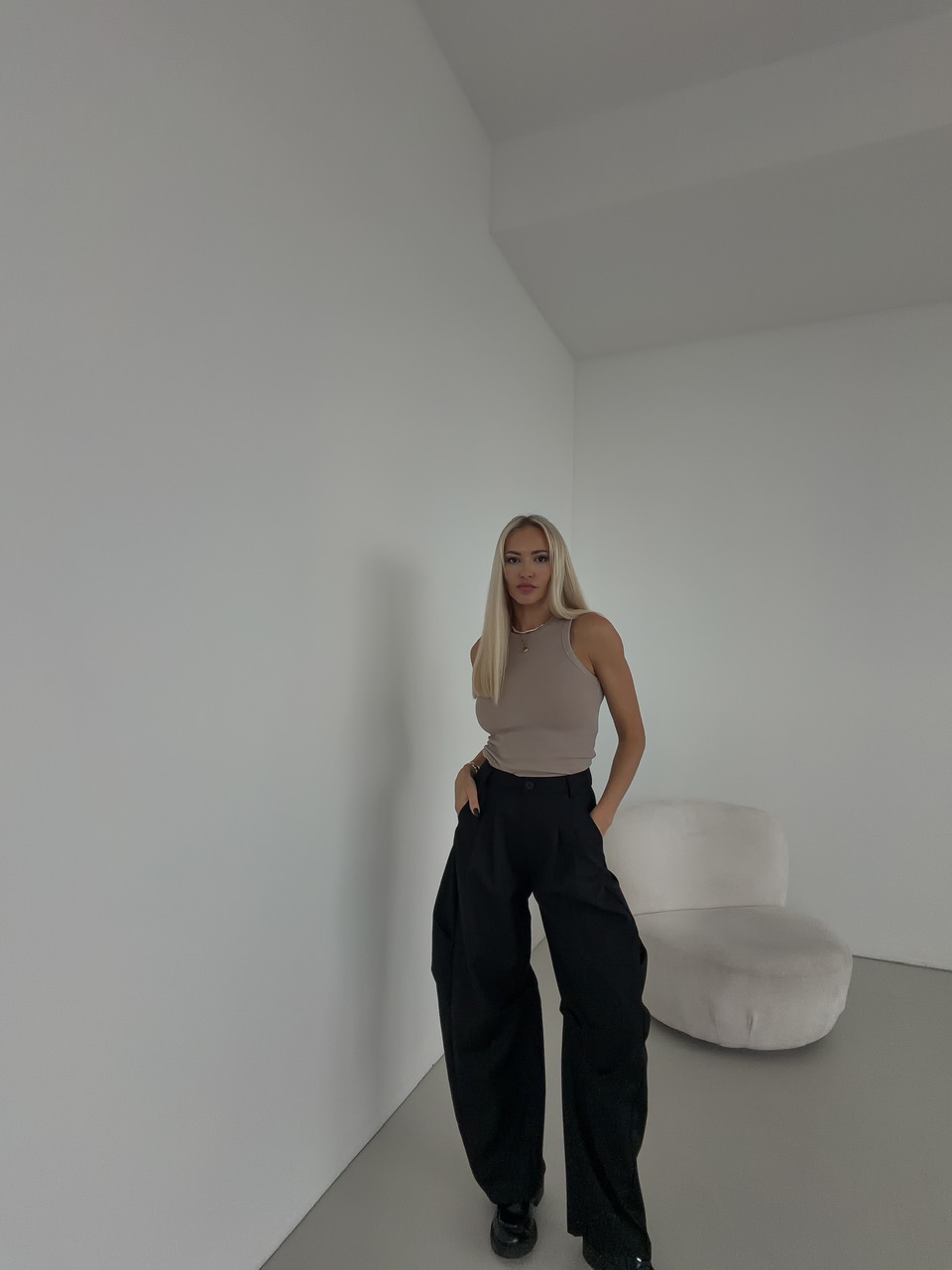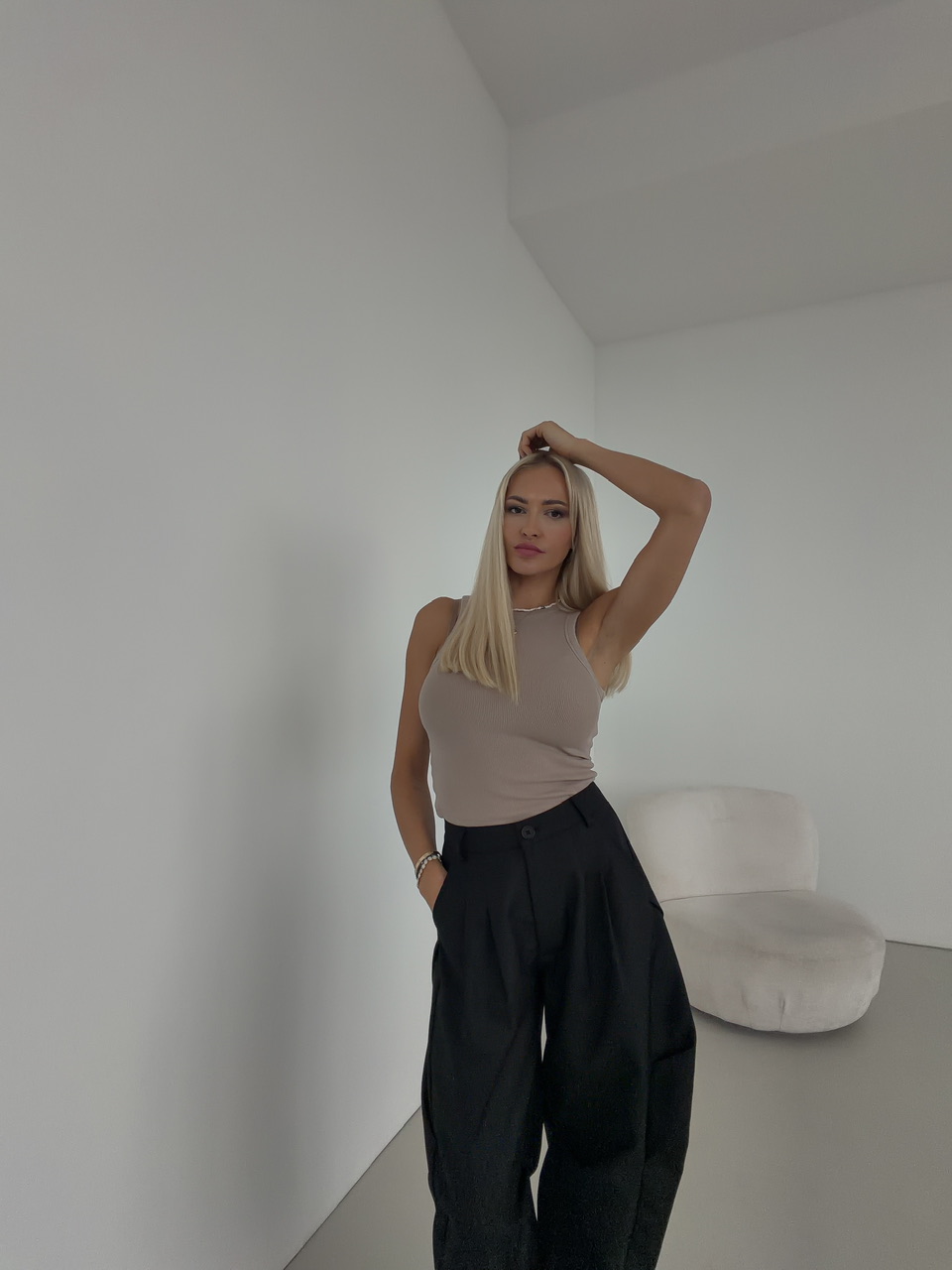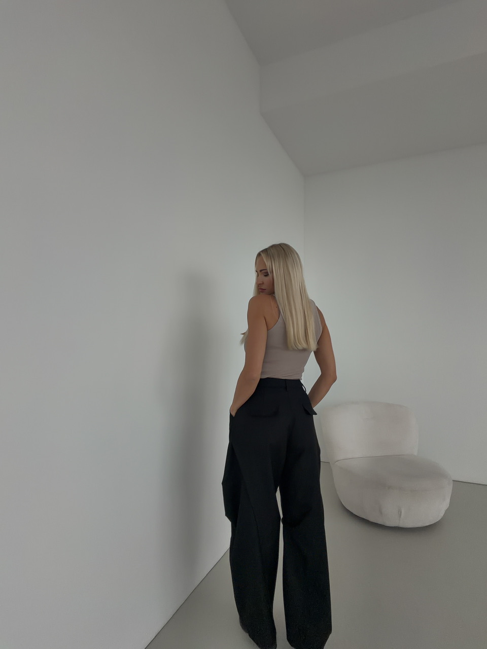 Štýlové voľné nohavice kombinujú pohodlie a moderný dizajn. Majú klasické zapínanie na zips a gombík, čo zaručuje jednoduché a bezpečné obliekanie. Nohavice sú vybavené falošnými zadnými vreckami, ktoré dodávajú minimalistický a čistý vzhľad, a praktickými bočnými vreckami, do ktorých pohodlne uložíte drobnosti. Pre lepšie prispôsobenie sú nohavice doplnené o putká na opasok, takže si ich môžete doladiť podľa svojho štýlu. Ich voľný strih poskytuje maximálne pohodlie pri nosení a ľahkú mobilitu.