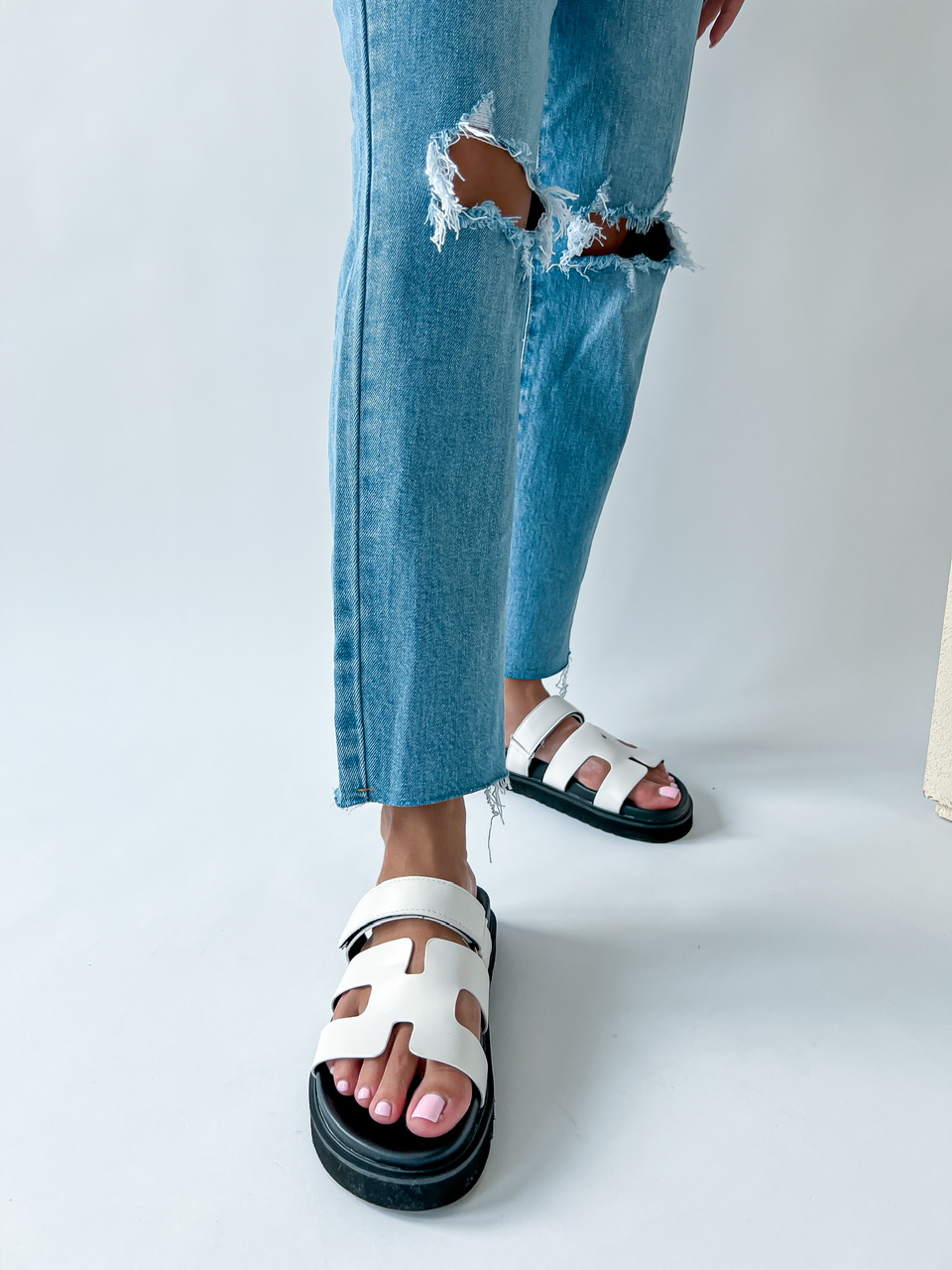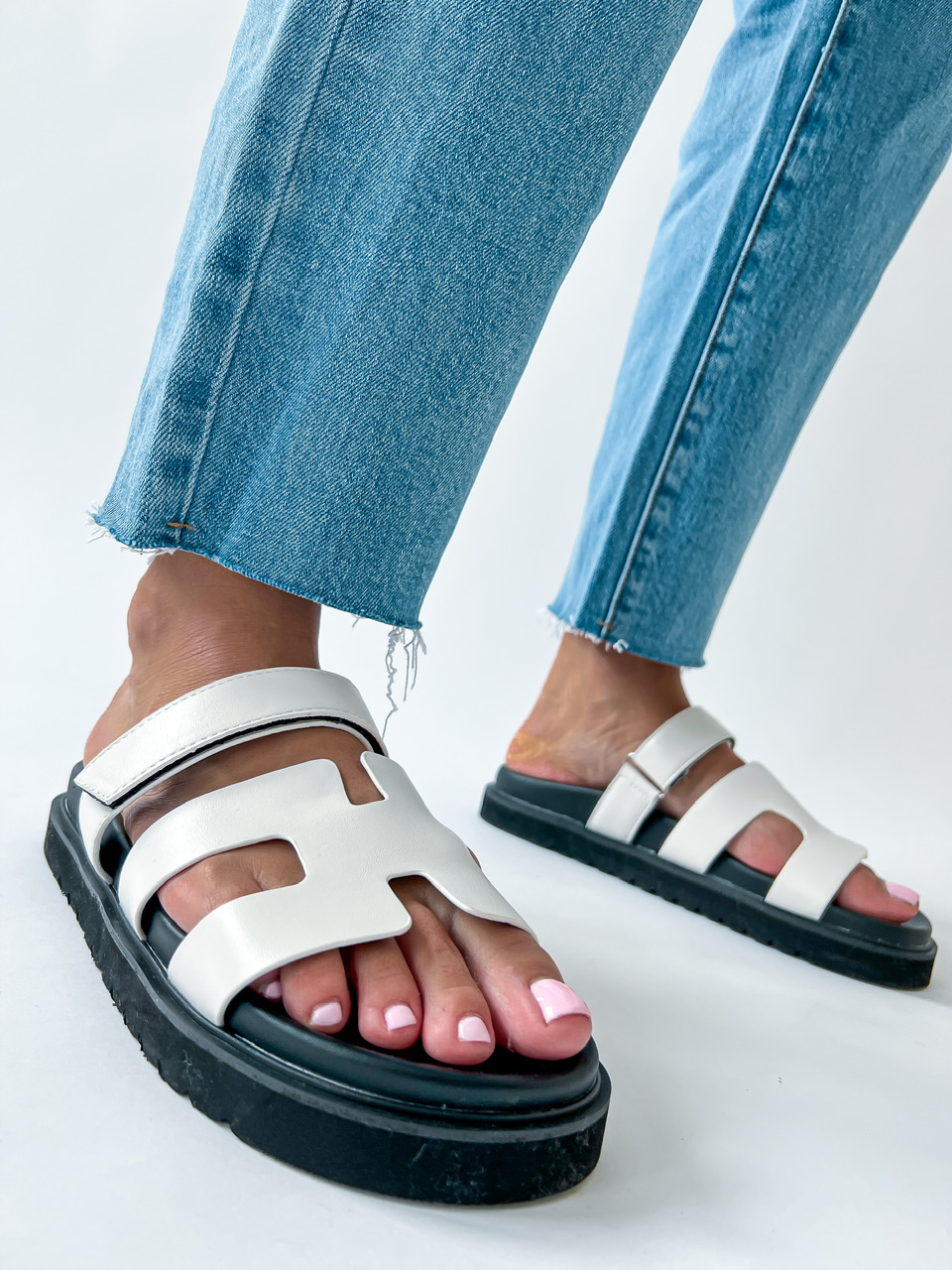 Nízke šľapky na výraznej čiernej podrážke. Zvršok sa skladá z dvoch častí. Jedna časť má suchý zips, ktorý sa dá prispôsobiť.