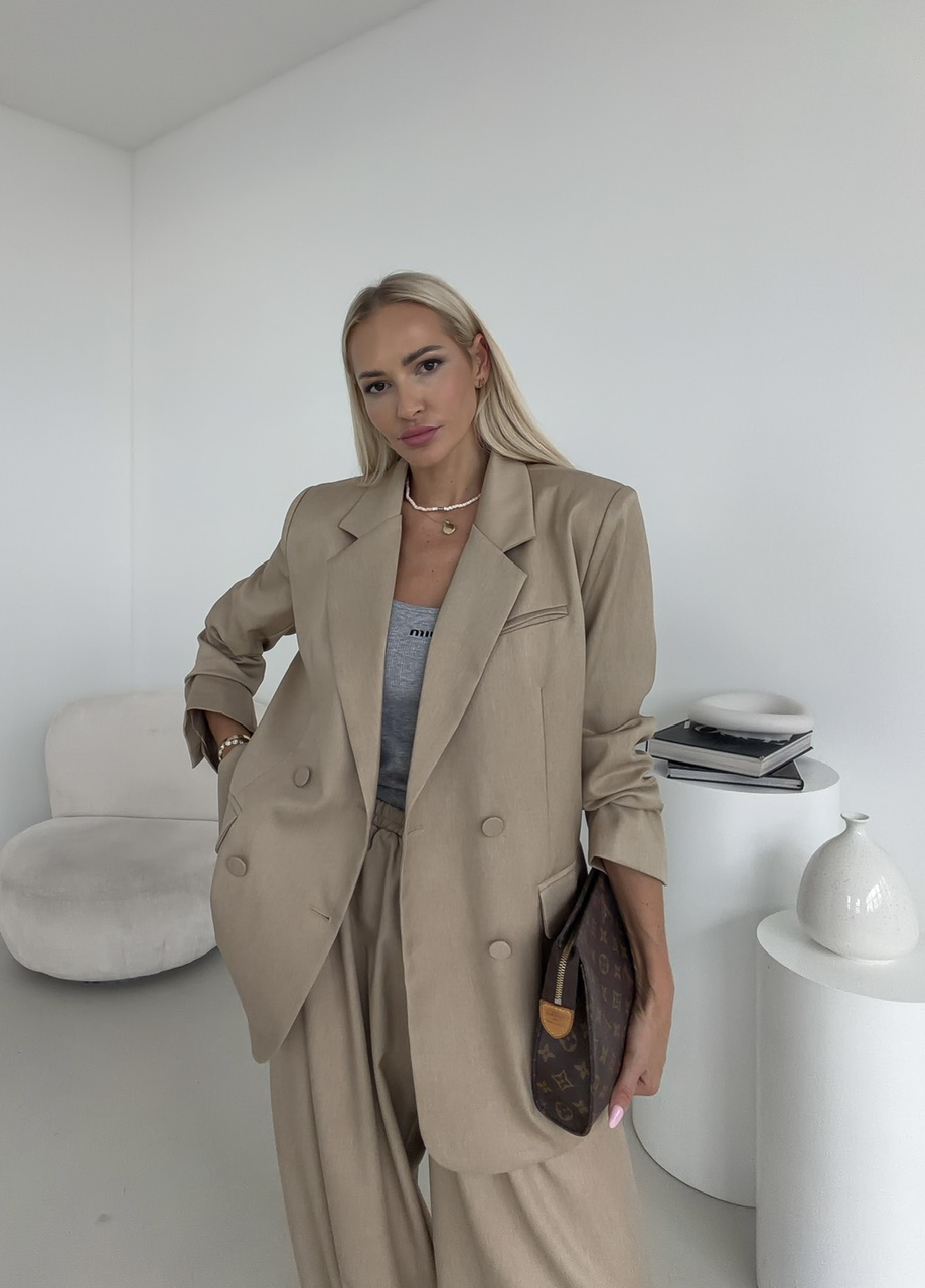 Štýlové dámske sako s dvojradovým zapínaním na gombíky prináša nadčasový a elegantný vzhľad vhodný do práce aj na spoločenské príležitosti. Vypchávky na pleciach jemne zvýrazňujú siluetu a dodávajú outfitu štruktúrovaný, sofistikovaný charakter. Sako je doplnené o falošné náprsné vrecko, ktoré podčiarkuje klasický dizajn, a dve praktické predné vrecká, ktoré kombinujú funkčnosť s moderným štýlom.